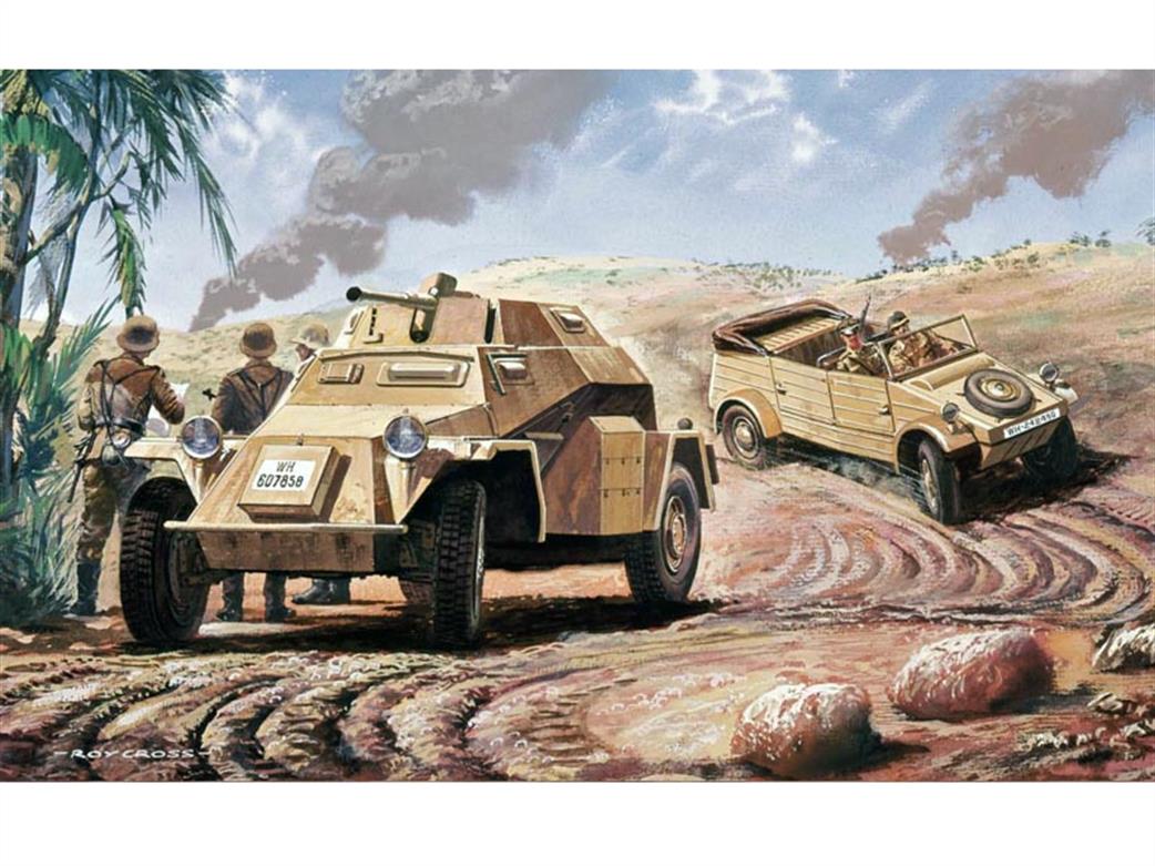 Armament consisted of a 2cm high velocity anti-tank gun and an MG34 machine gun. The K?belwagen also featured in this kit, was developed from the commercial Volkswagen by Dr. Ferdinand Porsche. Used mainly for reconnaissance, it was the workhorse of the German Army. By the end of WWII over 52,000 had been built. The 985cc engine had a maximum road speed of 80 k.p.h.