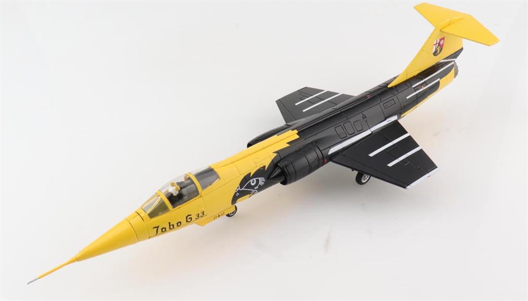 Aircraft F-104G 22+67 was manufactured by Messerschmitt as c/n 683D-7036 company model 683-10-19 completing its maiden flight on March 7, 1963. In May 1963 the aircraft was accepted and coded KE+336. The aircraft arrived at Buchel AB late May 1963 in a silver finish. In 1985 JaboG 33 had completed its transition to the Tornado from the F-104G Starfighter. In honor of the long service of the F-104 aircraft 22+67 was given a special “Geiger” paint scheme of a bright yellow with black markings. The aircraft now sits as gate guard at Buchel AB.