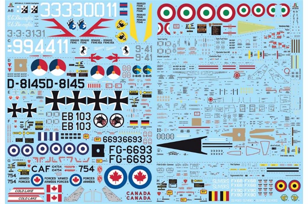 ITALIAN AIR FORCE ORPHEUS RECON POD - BULGED COVER FOR RECON PHOTO SYSTEM - 2 ALE 40 CHAFFS DISPENSERS - FINELY ENGRAVED RECESSED PANEL LINES AND RIVETS - FULLY DETAILED ENGINE , COCKPIT , AND AVIONICS BAY - FULLY DETAILED GUN BAY WITH COMPLETE M-61 VULCAN ASSEMBLY - OPEN OR CLOSED AIR BRAKES - PHOTOETCHED FRET - 325 PARTS - 2 HUGE DECALS SHEETS FOR 8 VERSIONS - INSTRUCTIONS SHEET WITH COLOR PROFILES