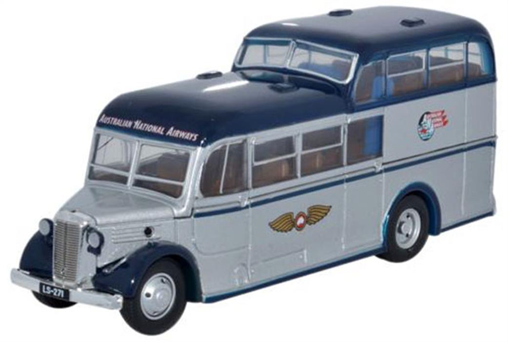 The Commer Commando was designed to accommodate up to 20 passengers and their maximum baggage allowance and was a favourite vehicle for many airlines with its 1 deck observation coach. Our fifth livery on this coach is as used by Australian National Airways and it is one of the most colourful to date with its two-tone steel blue and silver grey bodywork on a black chassis. Registered LS-271, it features the insignia of the airline on the upper bodywork and across the rear, detailing the globe with red/white Australian National Airways graphics, whilst the sides of the lower body feature the gold printed wings with the detailed outline of Australia in the centre. The interior has bright blue panelling with tan seating, while the outside is finished with lots of chrome and silver masking.