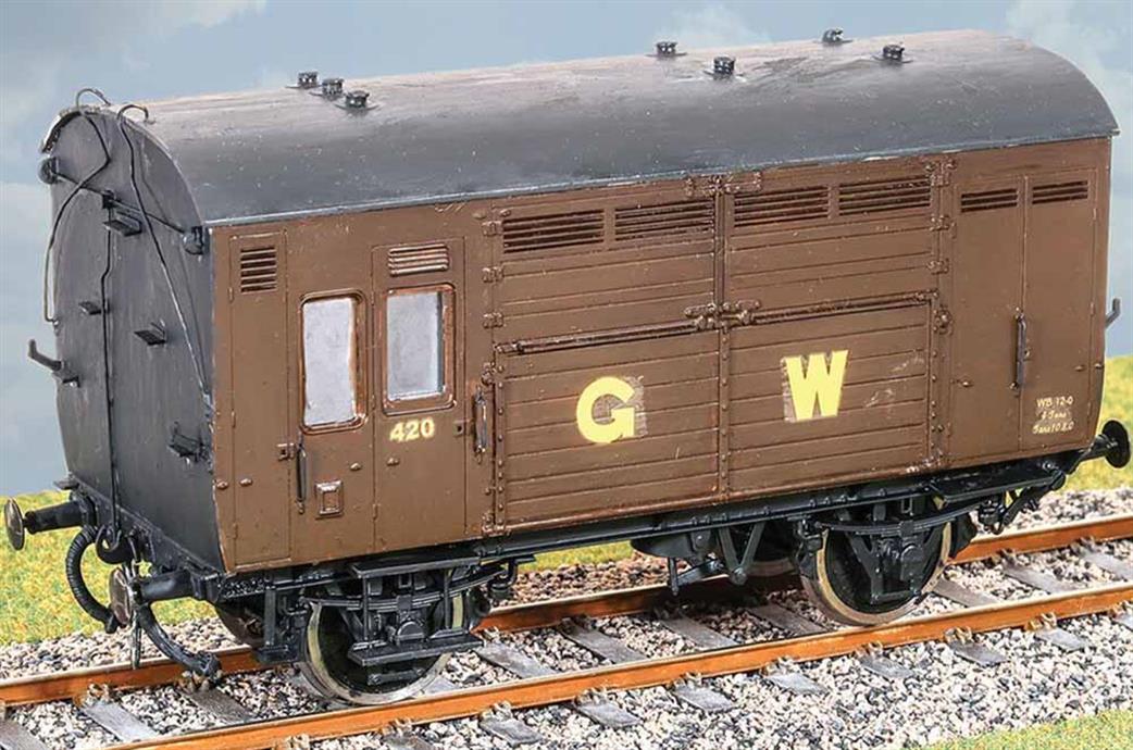 Horsebox vans were a common sight on Britains' railways until the 1960s. This model kit is the GWR design dating from the 1920s, with a grooms' compartment, large side doors to allow horses to be loaded and unloaded easily and a stowage compartment for fodder. Equipped with passenger type suspension, vacuum brakes and often steam heating these horseboxes would be conveyed by passenger trains on many branchlines and by secondary trains on the mainline. Long trains of horseboxes were also seen sometimes, especially when a major race meet or polo tournament was imminent!