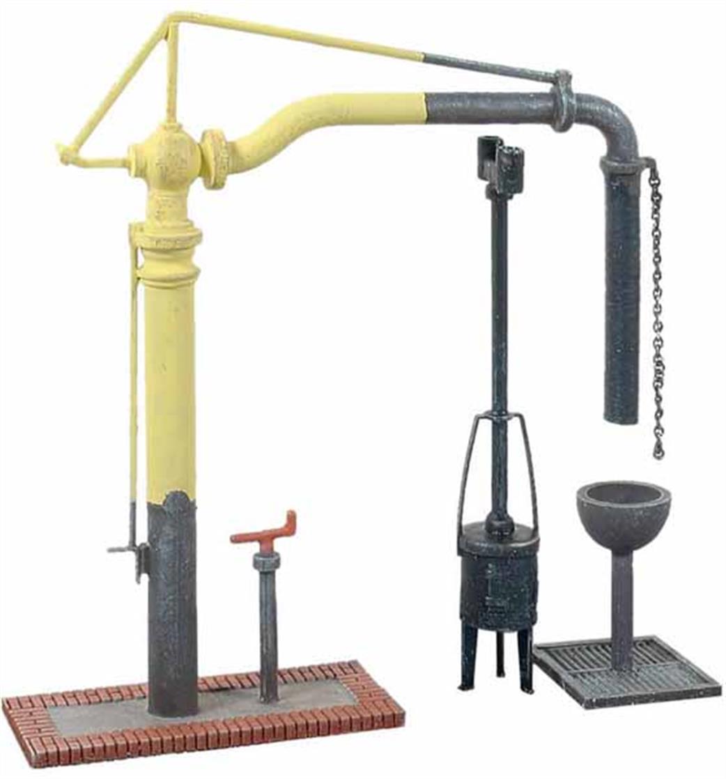 A simple plastic kit of the GWR standard pattern water crane, complete with base and control column. A drain grille with water catcher funnel is supplied to be positioned under the water bag in the rest position along with a fire devil with tall chimney.