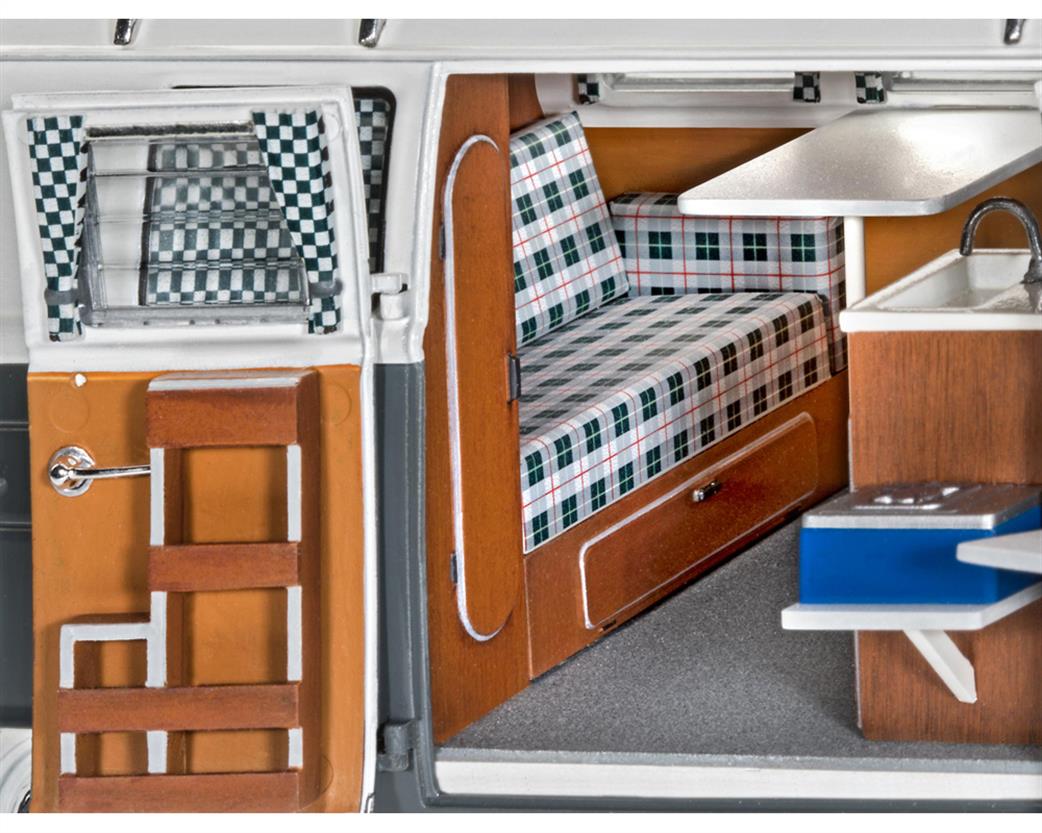 Go on a journey into the sixties with revell's 1:24 scale T1 Camper model kit. With its 189 pieces and dimensions of 180mm length, 77mm width and 99mm height, this model is a detailed reproduction of the famous T1 camper that revolutionized travel. Recommended for modelers aged 13 and over, this kit invites you to discover and recreate the charming design and innovative features of the original. In addition to the non-assembled model, the T1 Camper model kit contains an illustrated, multilingual building instruction and decals to personalize your model. The kit includes a multi-panel body, cabinets and rear benches, and movable doors for an authentic replica experience. This kit is ideal for model building enthusiasts aged 13 and over, from beginners to advanced models. It offers an educational and entertaining project for anyone who is passionate about automotive history and travel culture. The finished model is a wonderful display piece that captures the golden era of travel in a compact format. The T1 Camper model kit impresses with its attention to detail and authenticity. The multi-part body, interior furniture and movable doors bring the legendary camper to life. With the included decals, you can customize the model and attach different license plates (D, NL, F, GB, B, A, CH, I, S and USA).