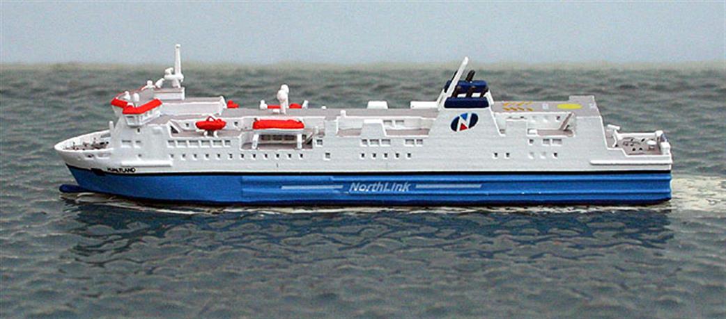 A 1/1250 scale waterline metal model of Northlink Ferries Hjaltland by Rhenania Junior RJ308C. This collector's model of Hjaltland, the old Norse name for Shetland, is handmade in Germany by Rhenania Junior and is fully assembled and painted.