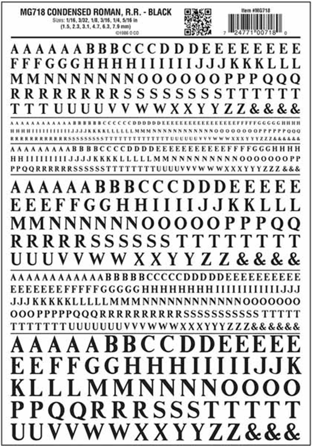 Woodland Scenics MG718 Dry Transfer Decals Condensed Railroad Roman Lettering Black